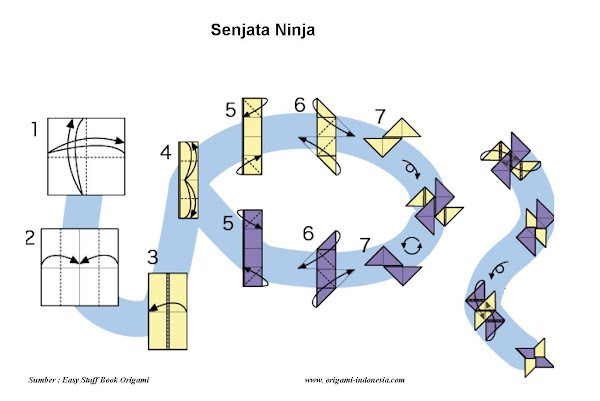 Origami Senjata Ninja ini salah satu model origami yang menjadi favorit bagi anak-anak, terutama anak laki-laki. Model origami Shuriken dibuat dari 2 lembar kertas disarankan dengan 2 warna, cara-caranya adalah sebagai berikut: